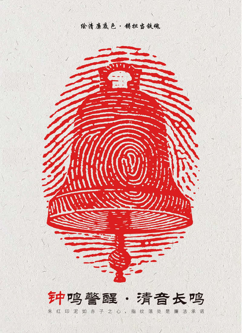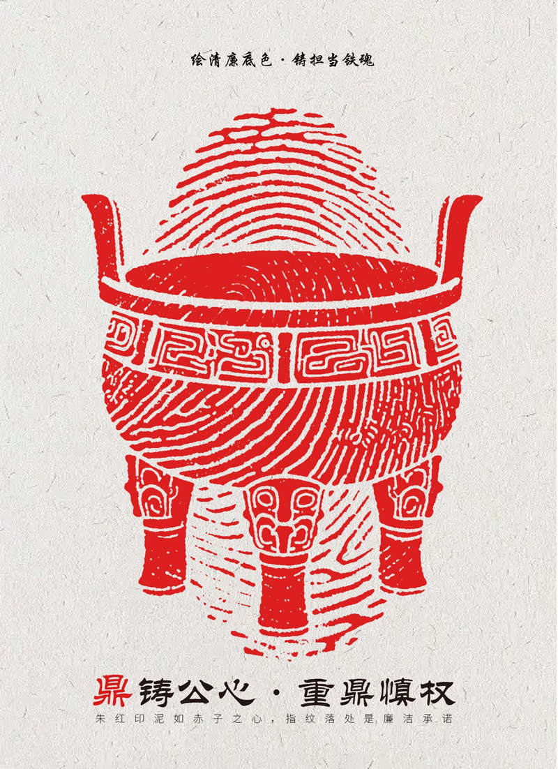 本系列公益海报设计以“红色指纹”为核心创意符号,将其与“镜、鼎、钟”三件文物古器的纹理融合,构建出一套关于“承诺与责任”的廉政视觉体系。红色指纹既是庄重的个人承诺,亦是鲜活的集体印记,将抽象的文物符号转化为了可视化的艺术表达。